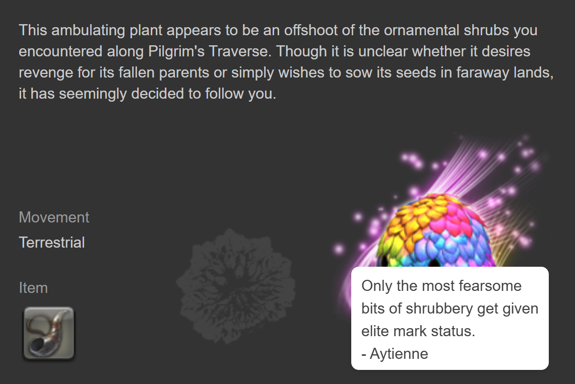 So that concludes my record of the mount “Ornamental Shrublet” on Pilgrim’s Traverse!