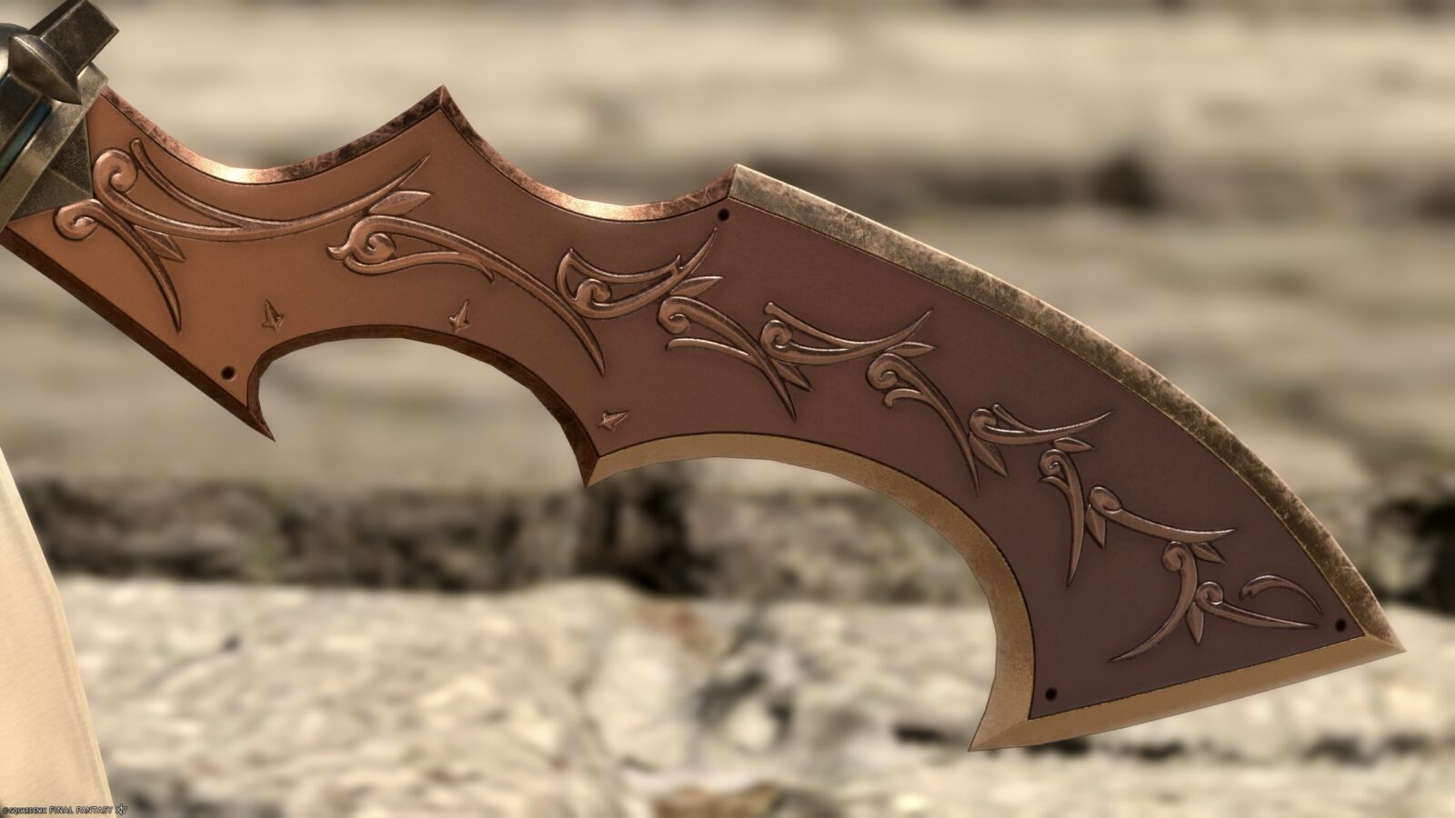 It is bronze in color and has a unique shape resembling a curved hatchet.