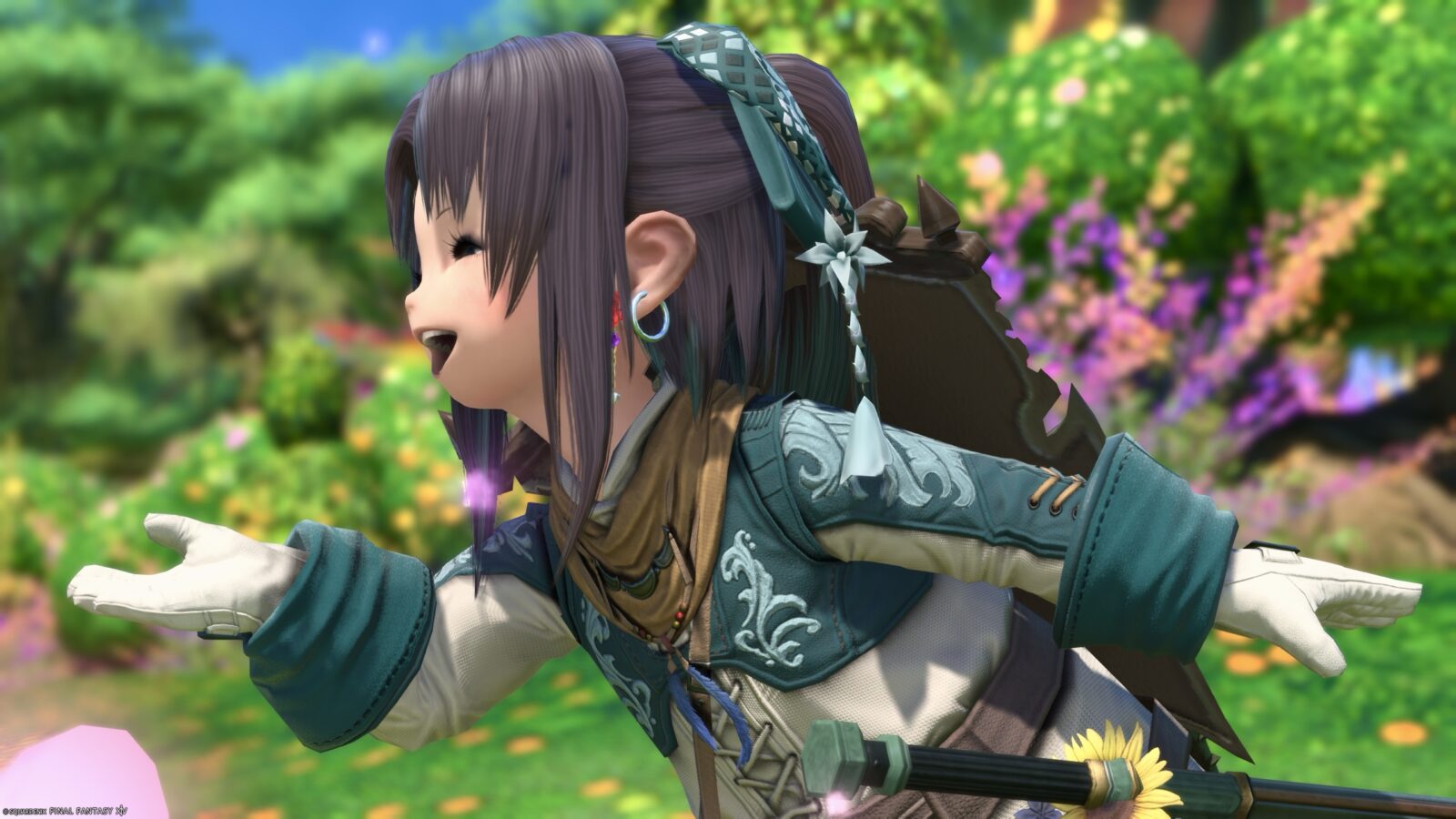 Around her waist she has a bag filled with flowers and a bell, which is really cute♪