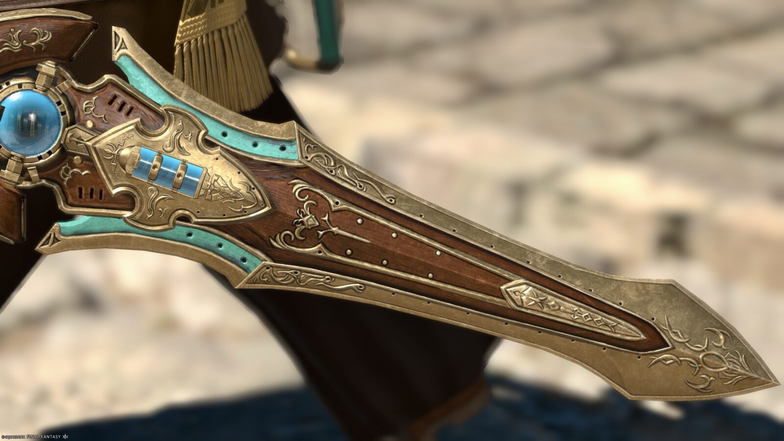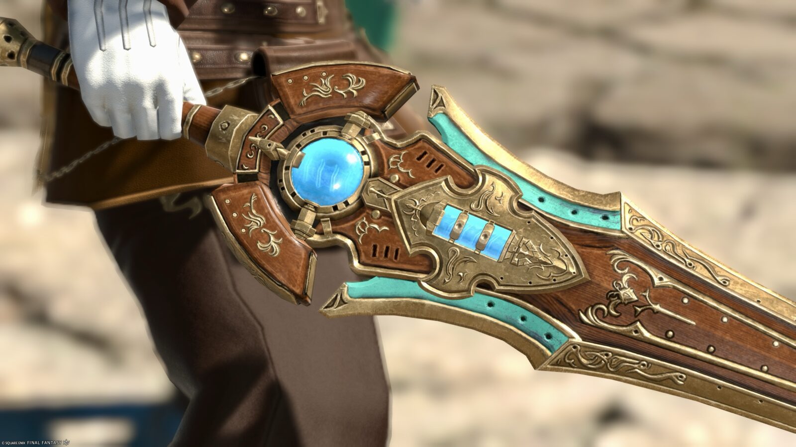 It’s an antique brown weapon, but when you get closer you can see that it’s actually made of wood.