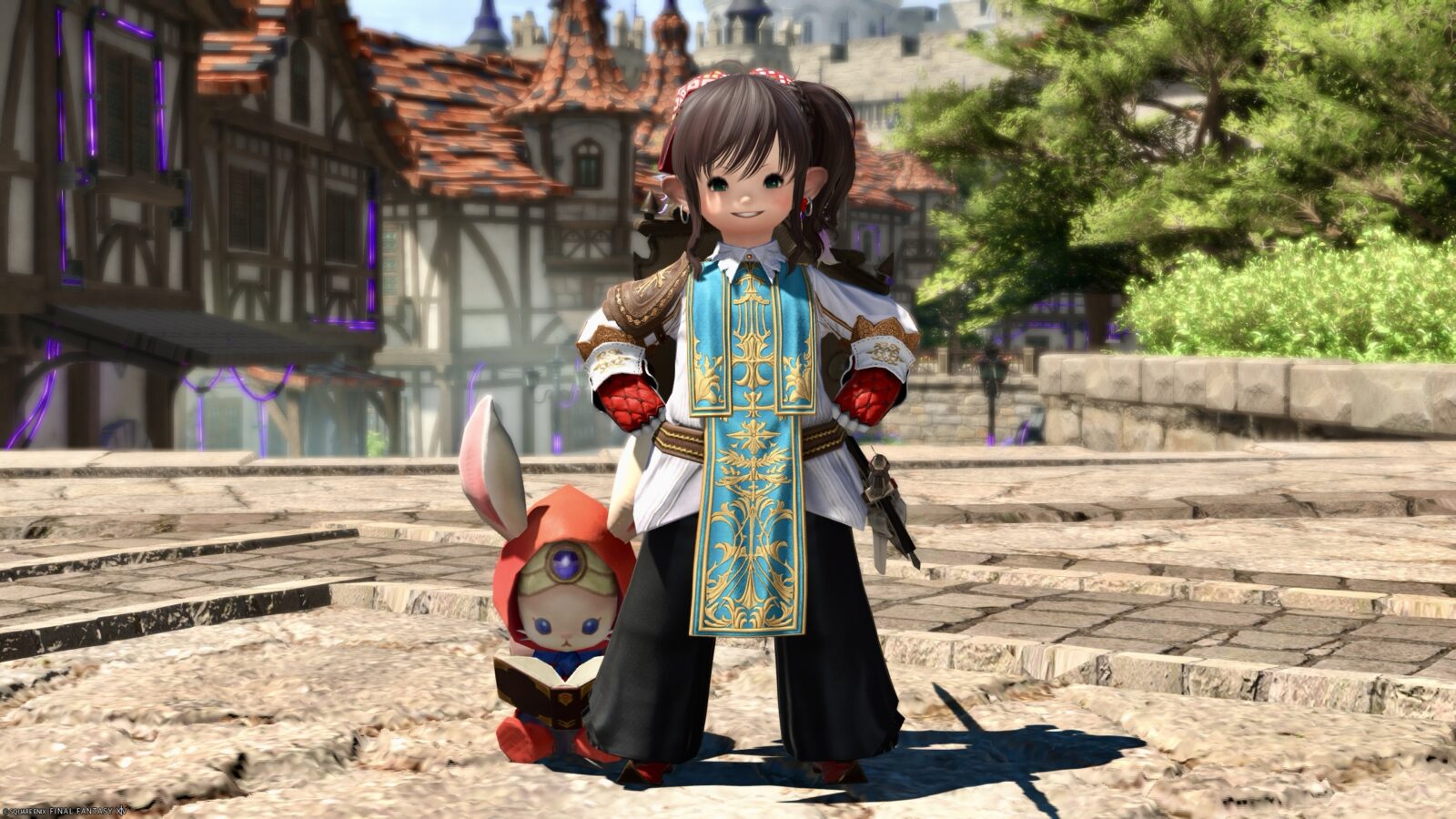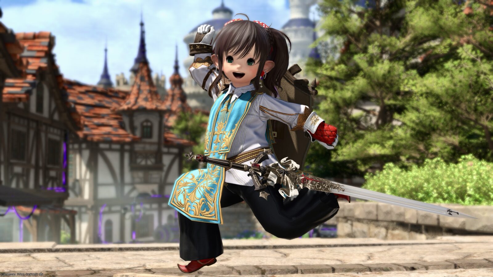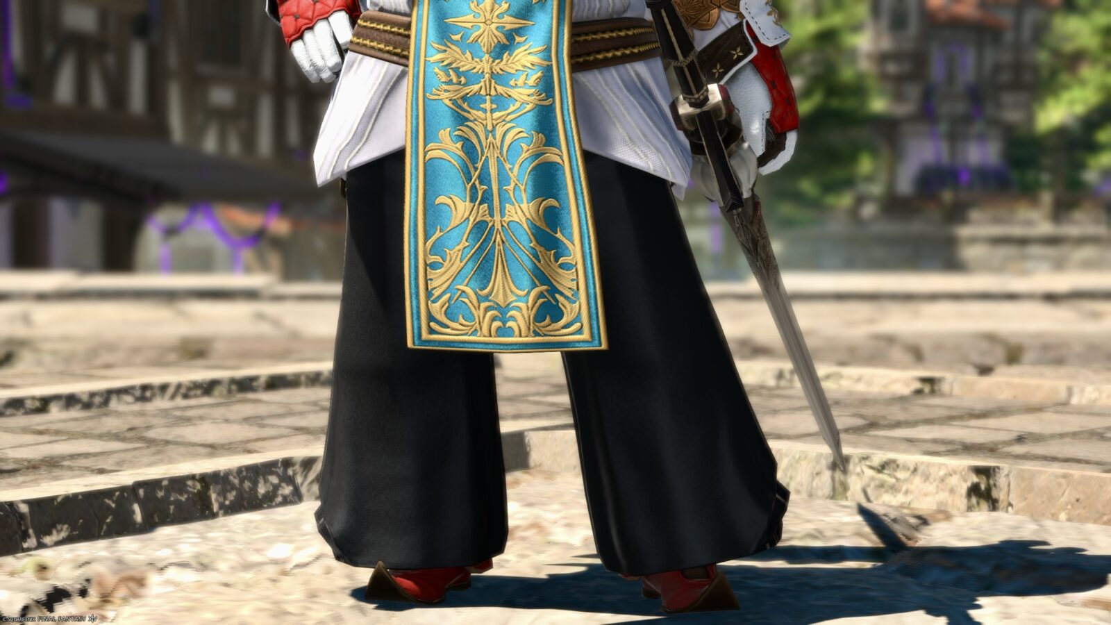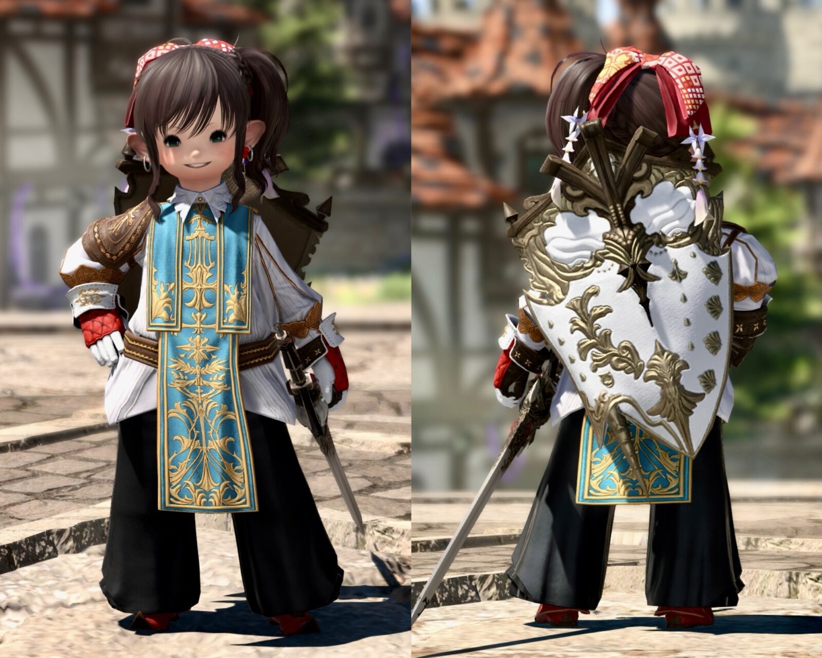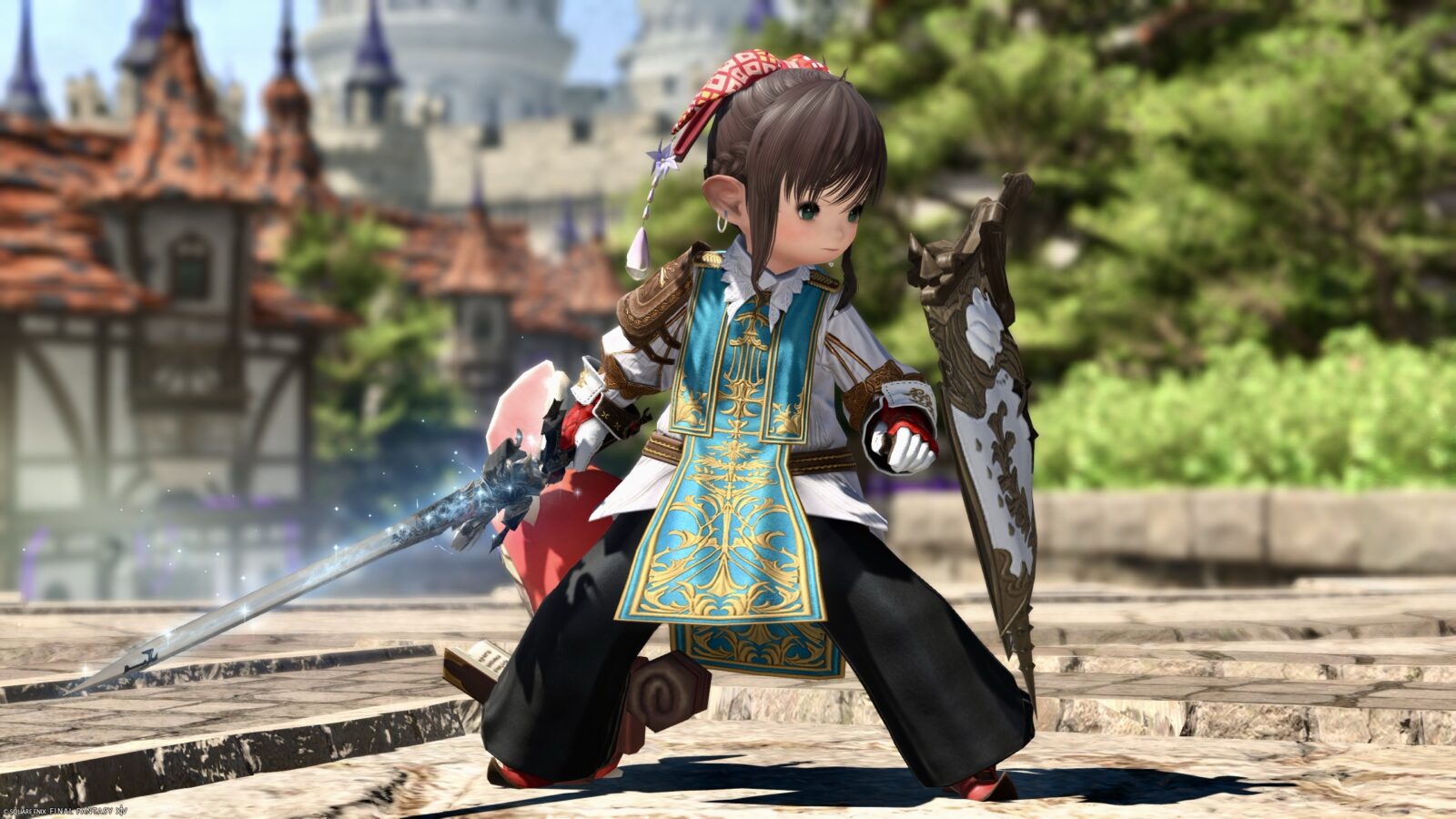 The shining sword with ribbon and pure white shield add a touch of pure knighthood.