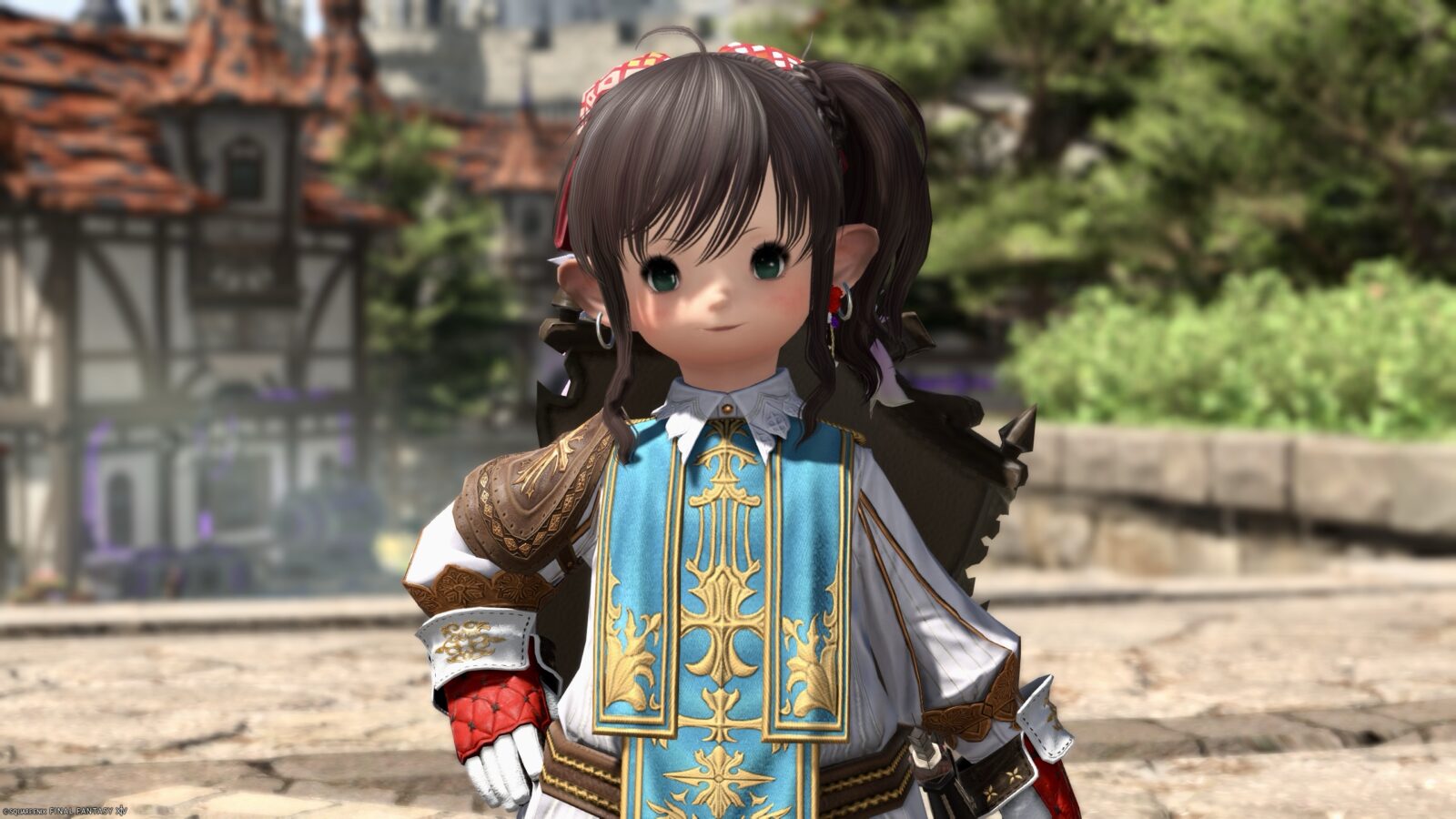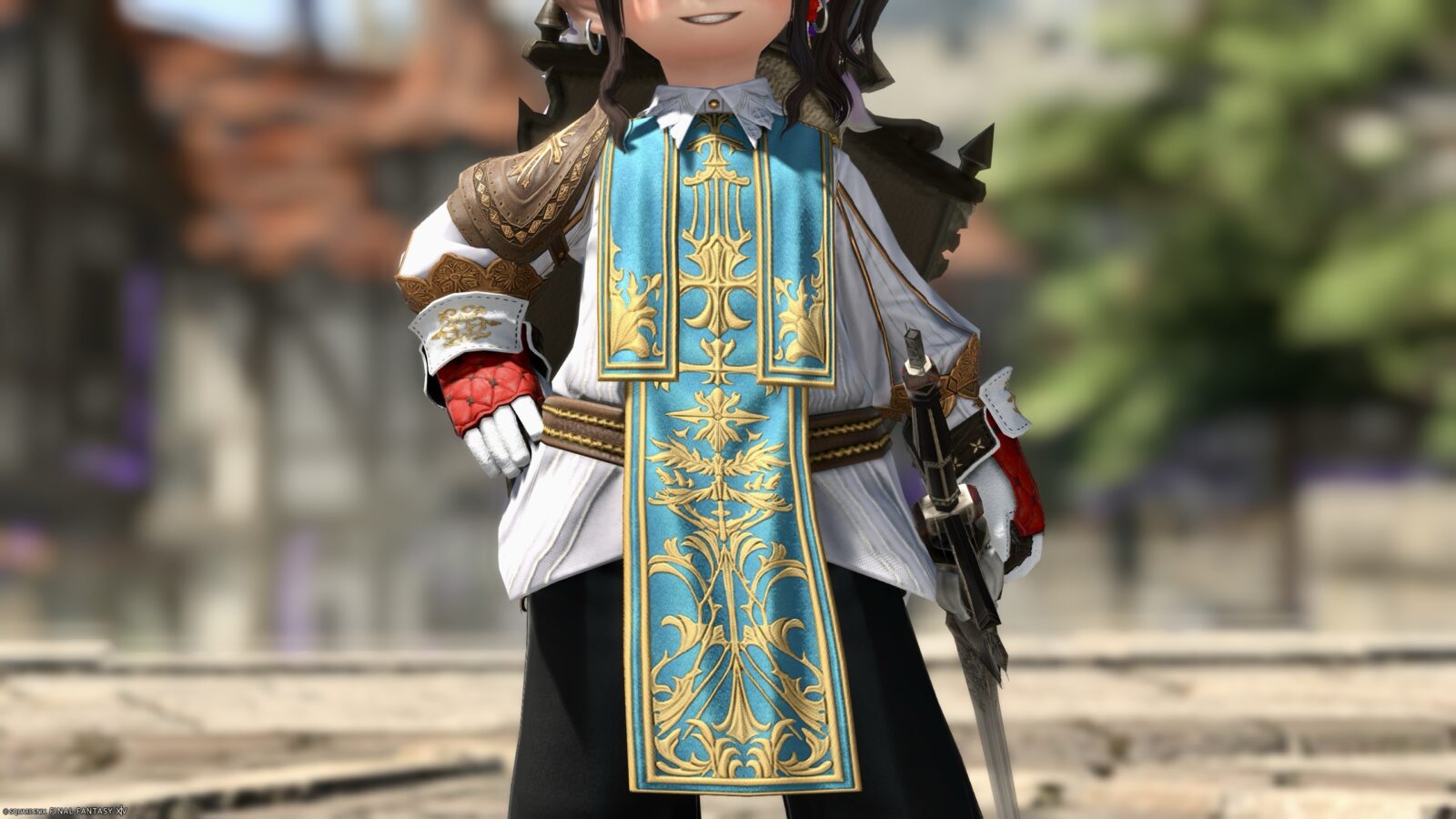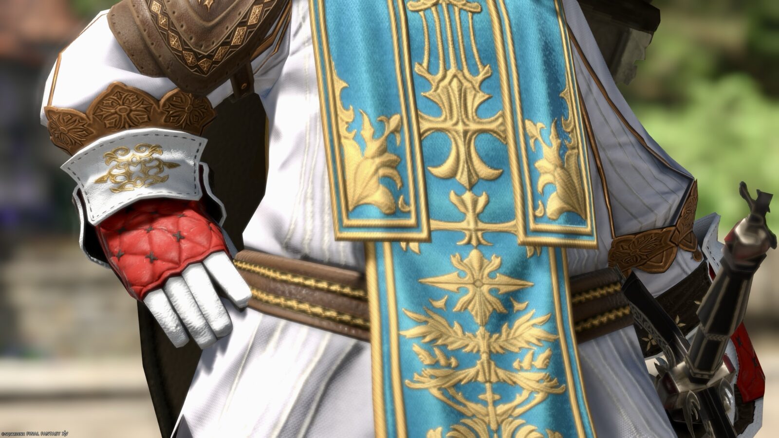 The emerald green apron (?) stands out, but the neat collar and the leather shoulder pad with a cross design on the right shoulder give the outfit an overall very noble feel.