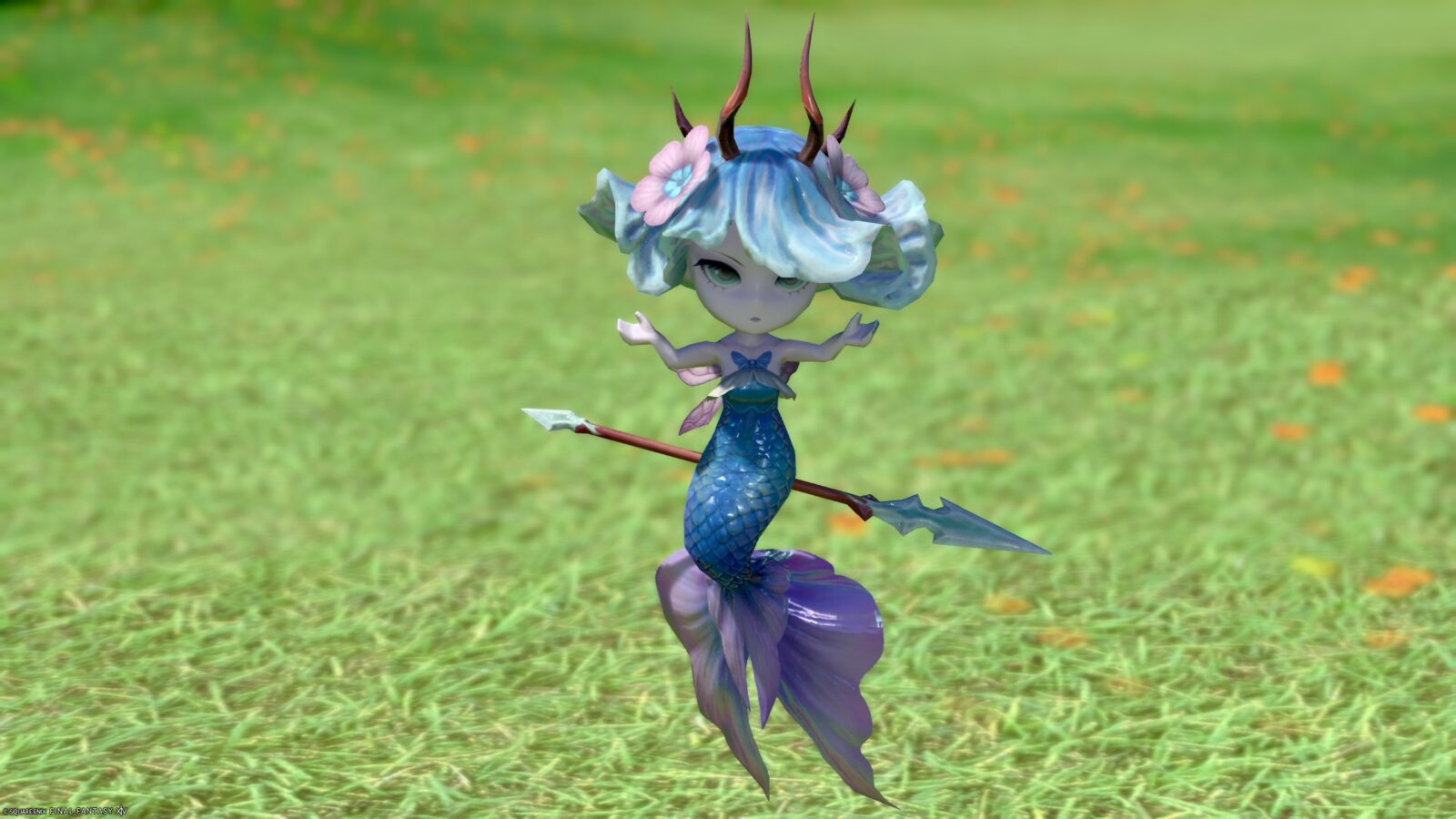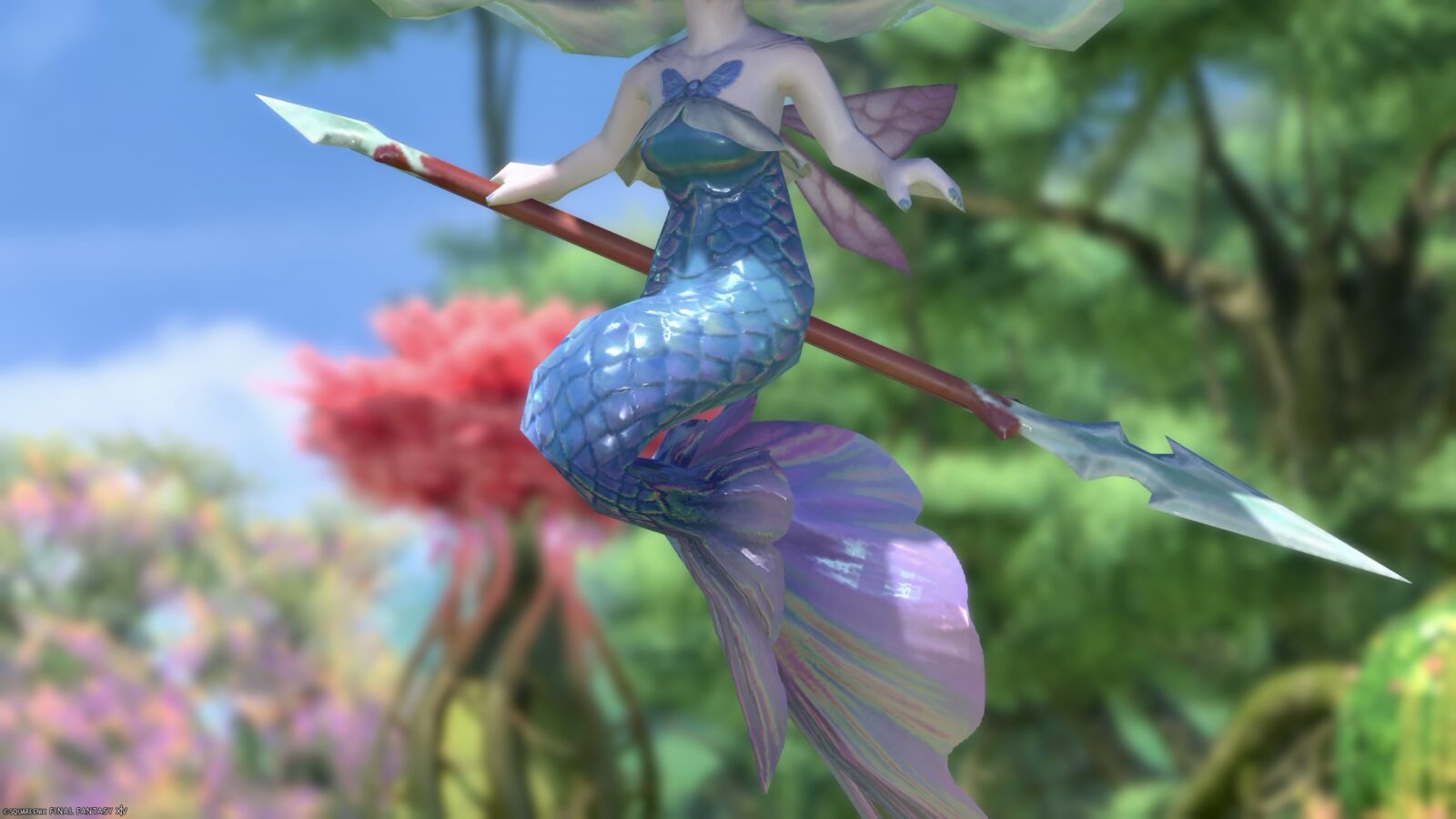 However, her body is definitely that of a mermaid! She is holding a spear in her hand.