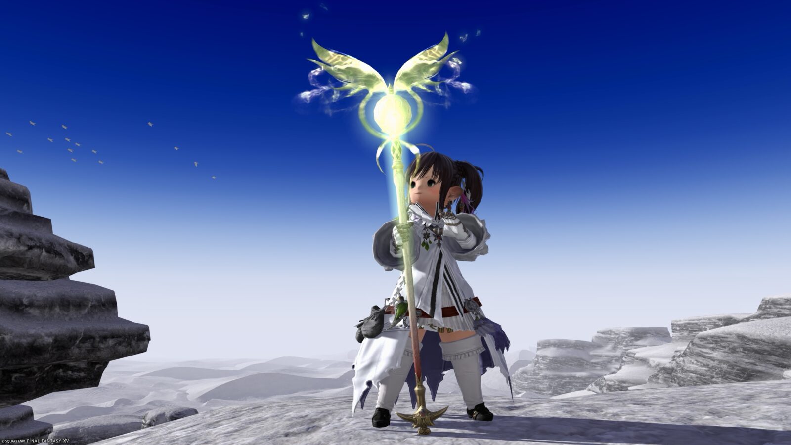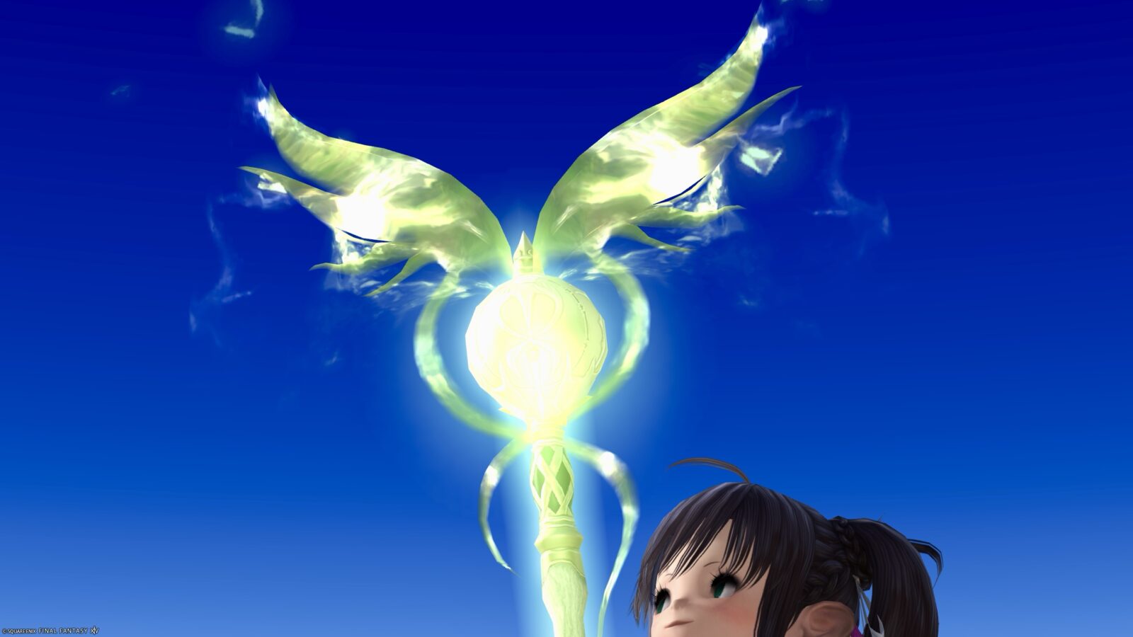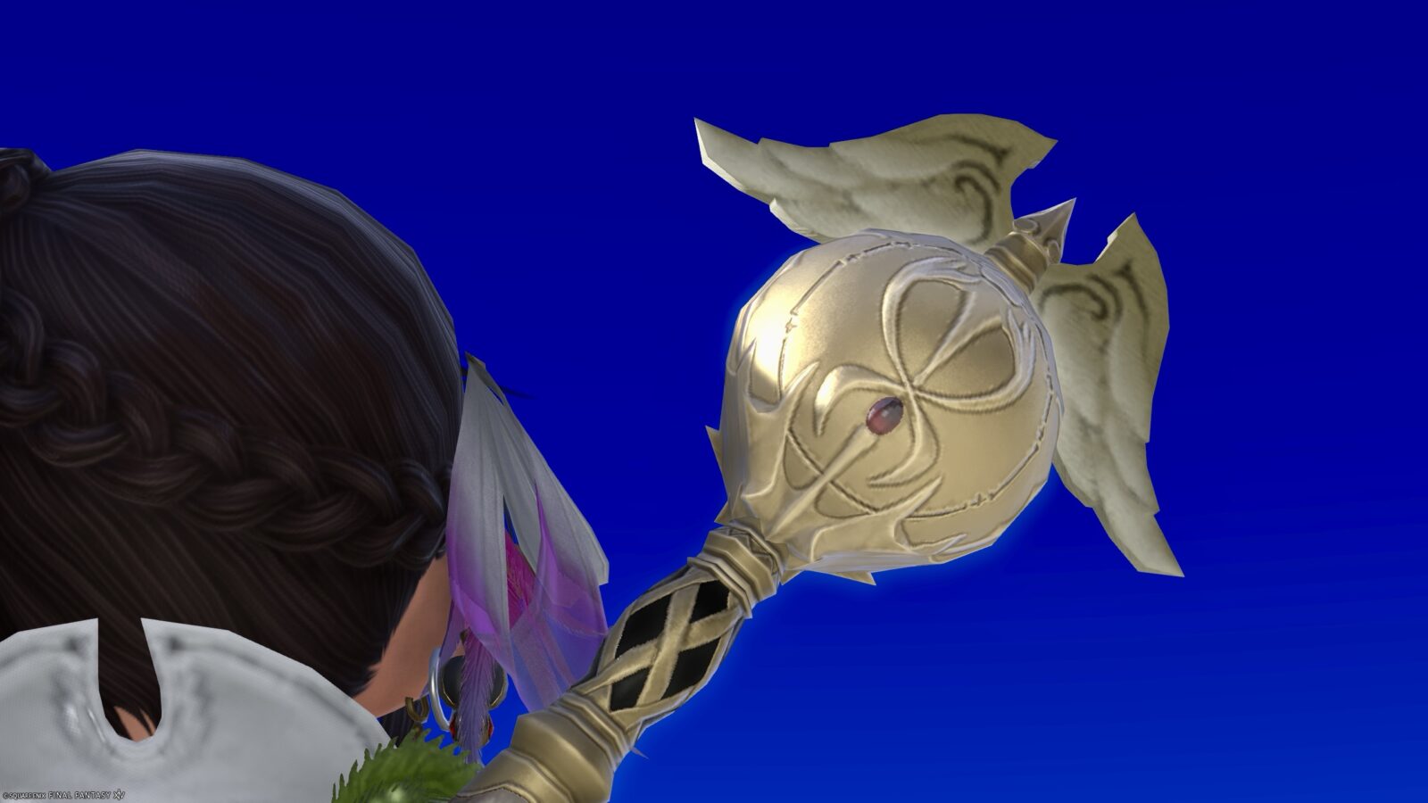 When sheathed on your back, it’s an adorable staff, with a champagne-gold sphere and tiny wings.