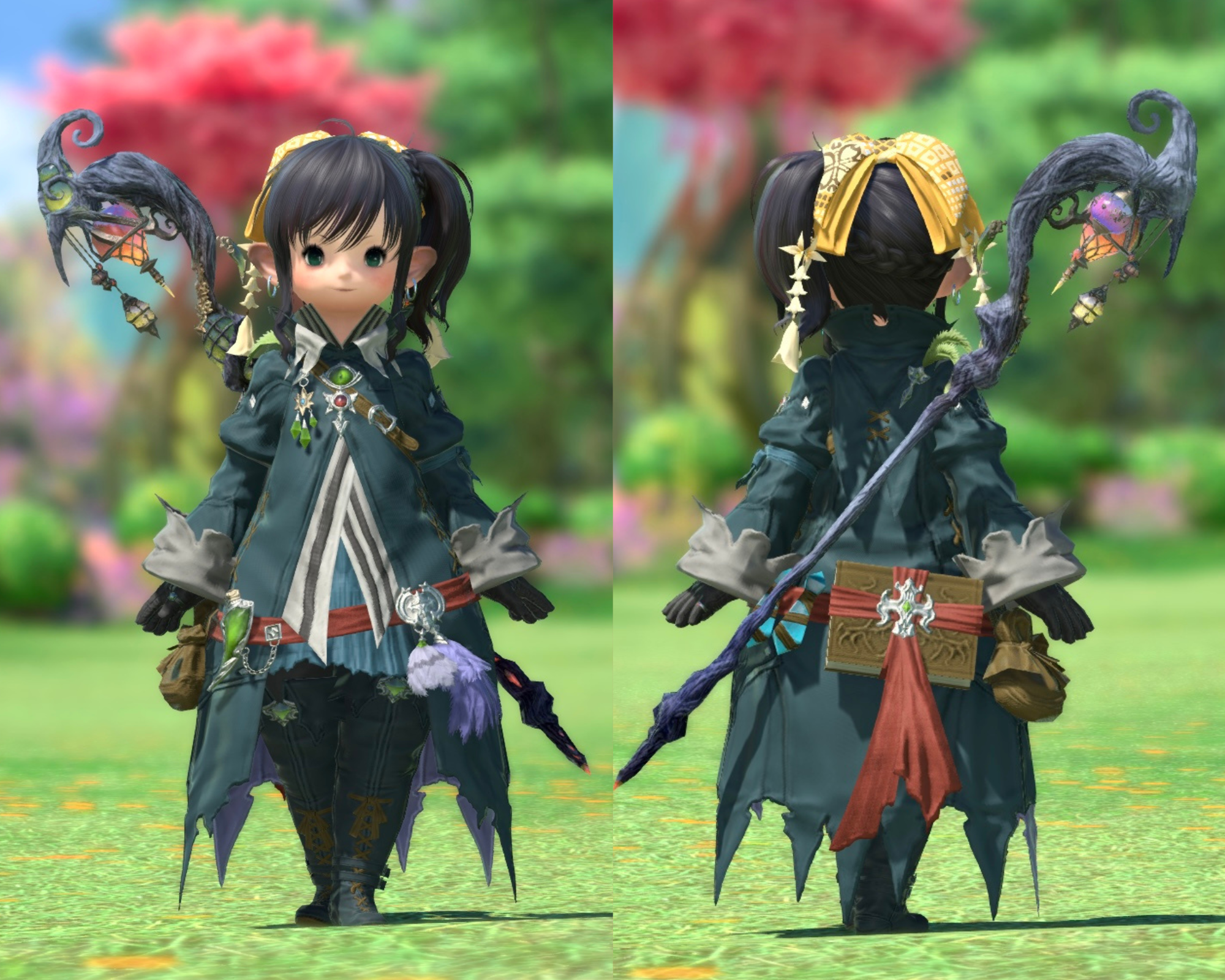 背負っているだけだと、黒魔道士のAF3武器『ウェザード・ヴァナルガンド』と全く同じです。シルフの森のようなランプがとっても可愛らしい。
