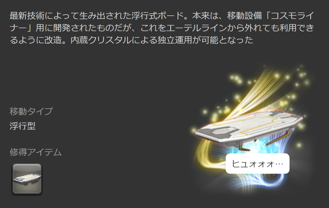 なお、この『コスモボード』は、コスモエクスプローラーの惑星パエンナで惑星パエンナ探索計画の証書を60枚集めると交換できます。また、売買可能なのでマーケットボードでも入手可能です。