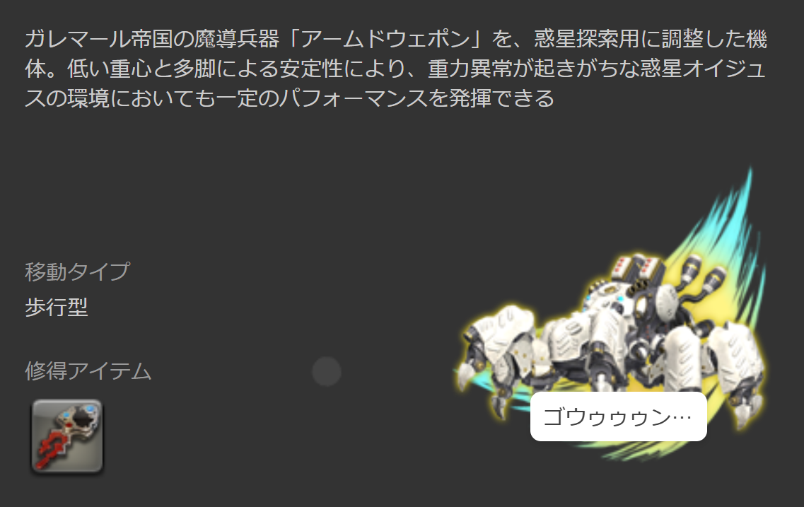 これは、コスモエクスプローラー惑星オイジュスのマウント『コスモ・アームドウェポン』の記録です。