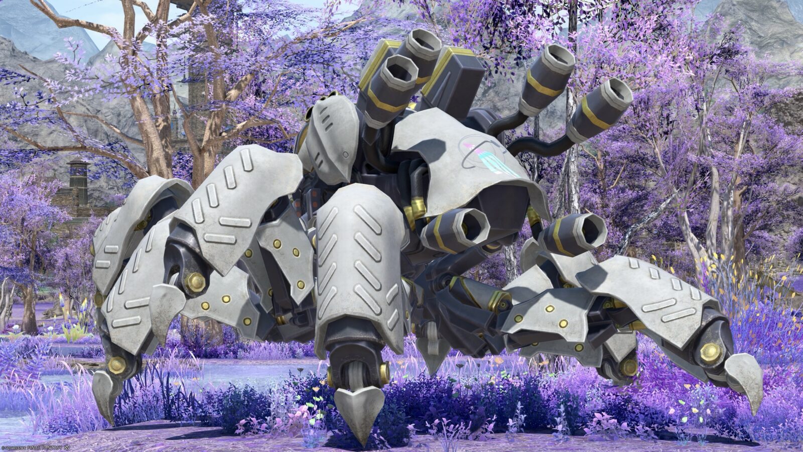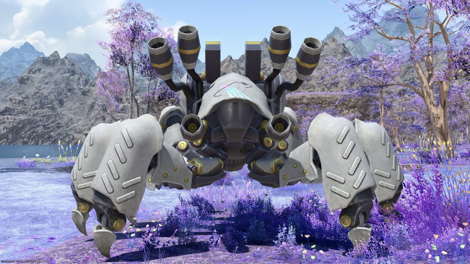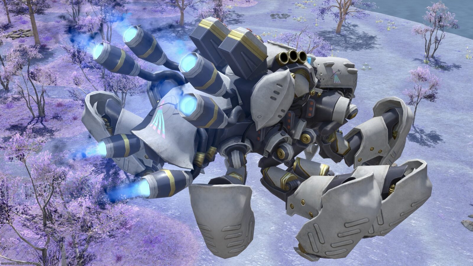 惑星オイジュスの白い多脚歩行ロボットマウント・魔導兵器『コスモ・アームドウェポン』
