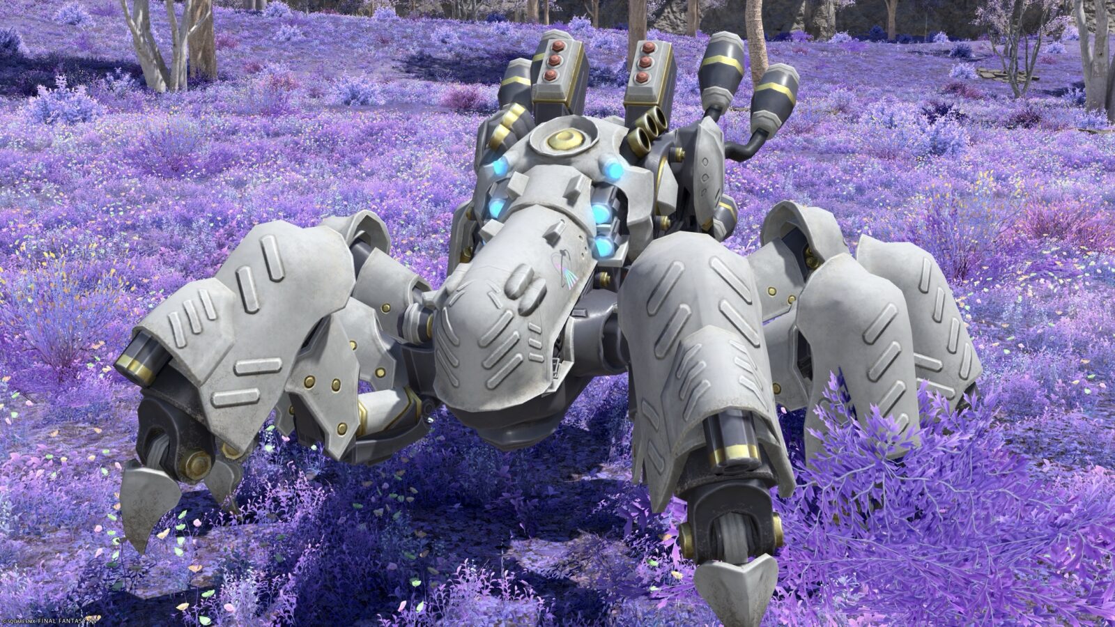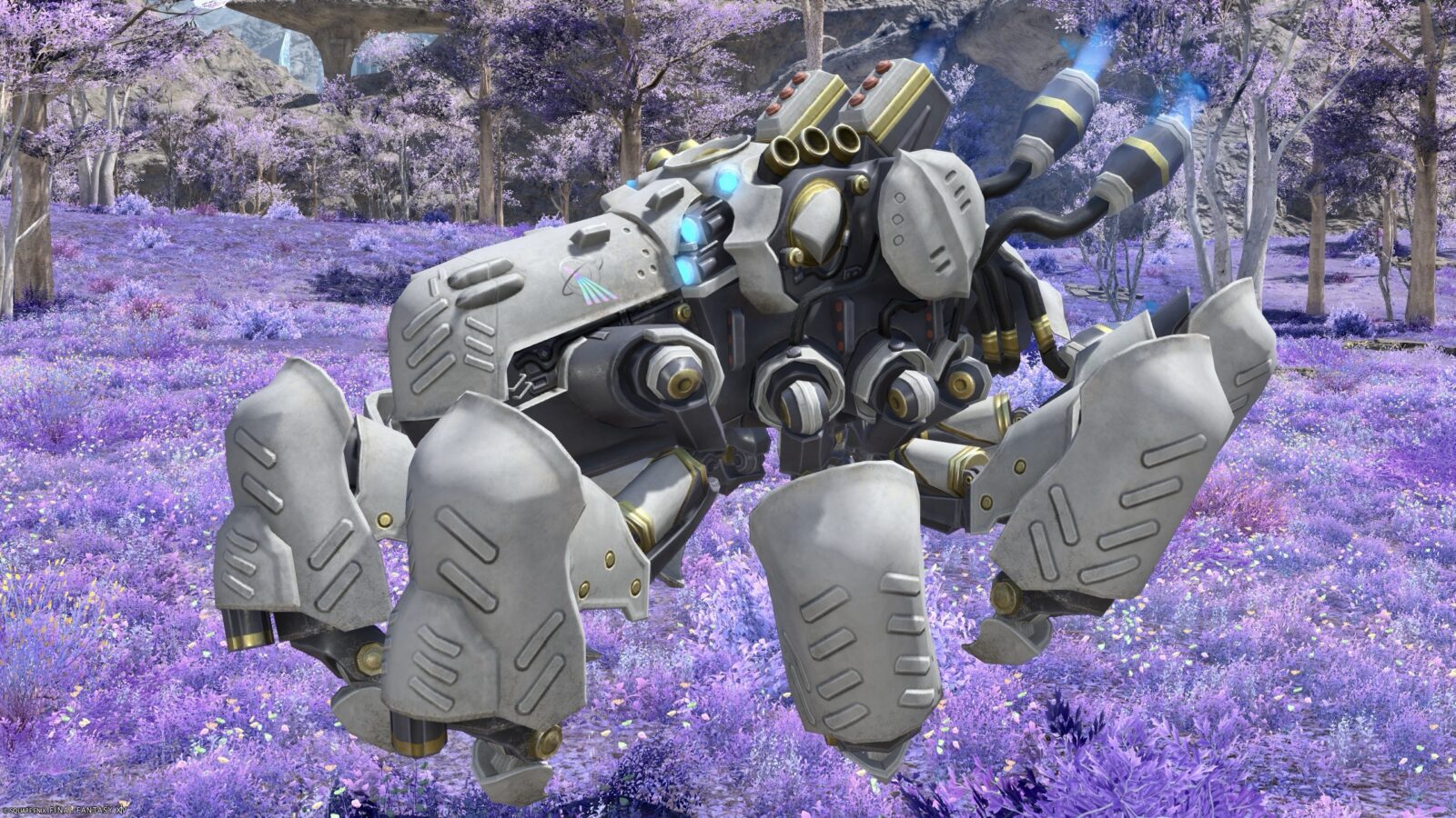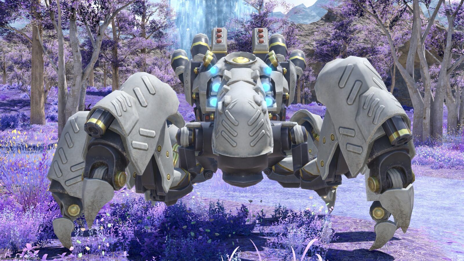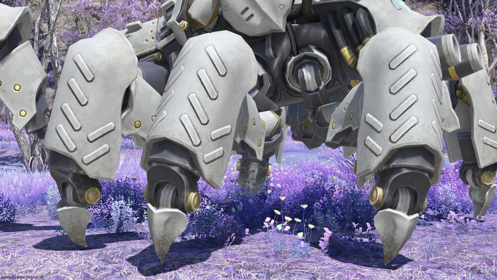 惑星オイジュスの白い多脚歩行ロボットマウント・魔導兵器『コスモ・アームドウェポン』