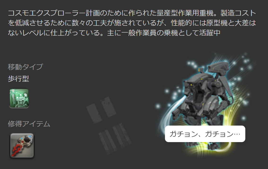 なお、この『量産型パワーローダー』は、コスモエクスプローラーの各惑星で、コスモクレジット20,000と交換で入手できます。