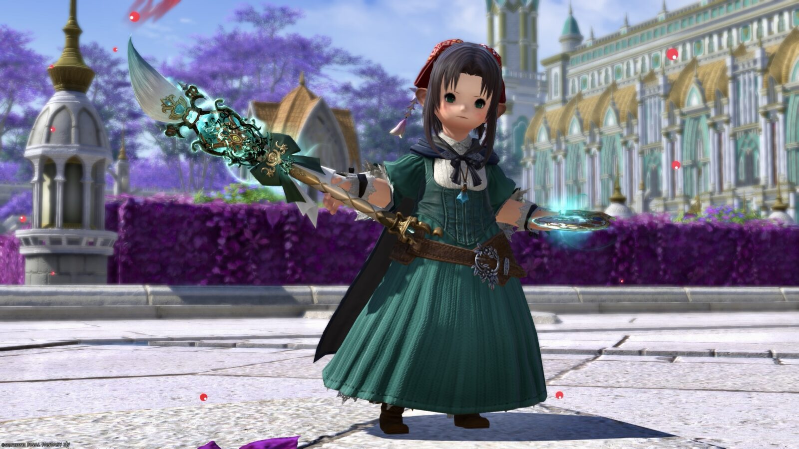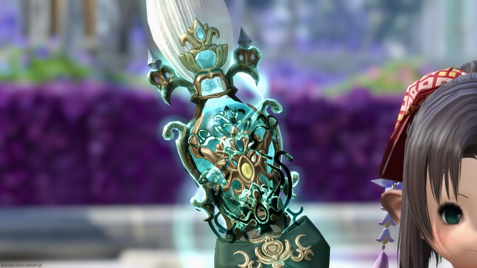 大きなエメラルドのような宝石の上に高貴でナチュラルテイストな装飾が施されています。