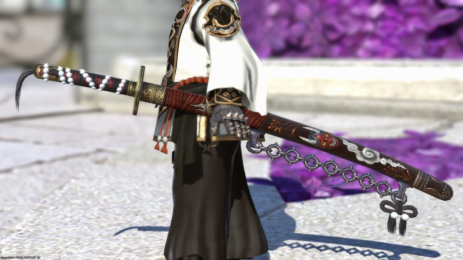 ①で剣先および鞘の鬼の顔と布部分の色が変わり、②で鞘の木の部分の色が変わります。