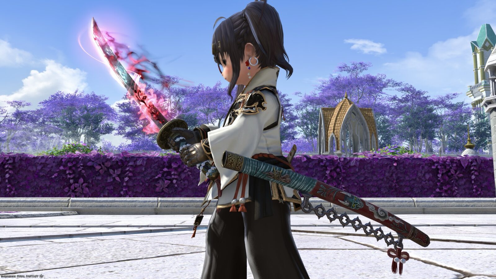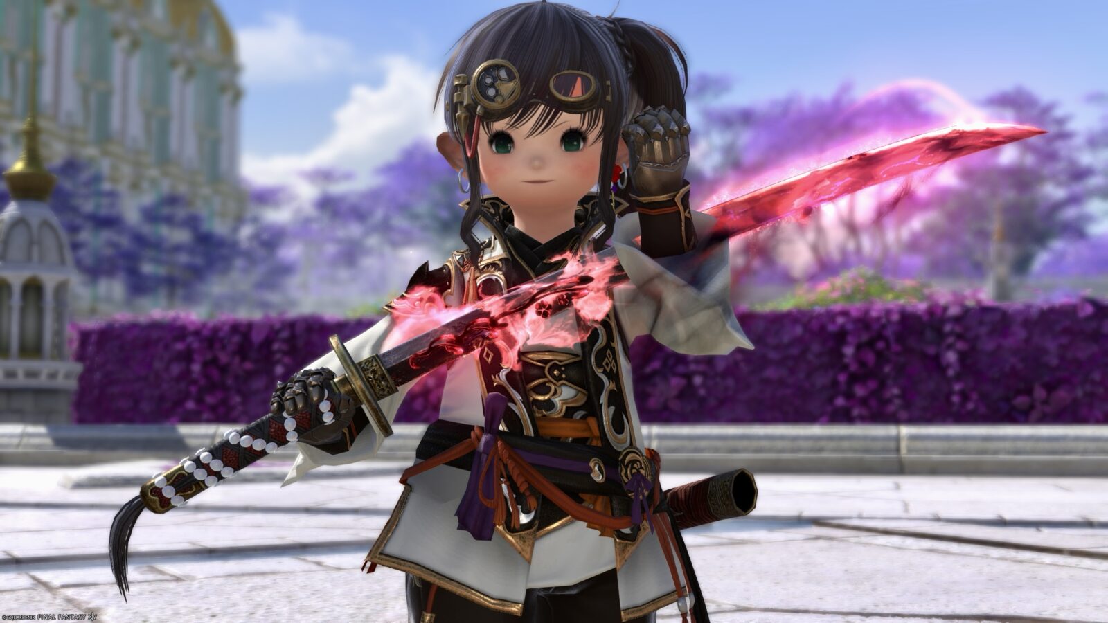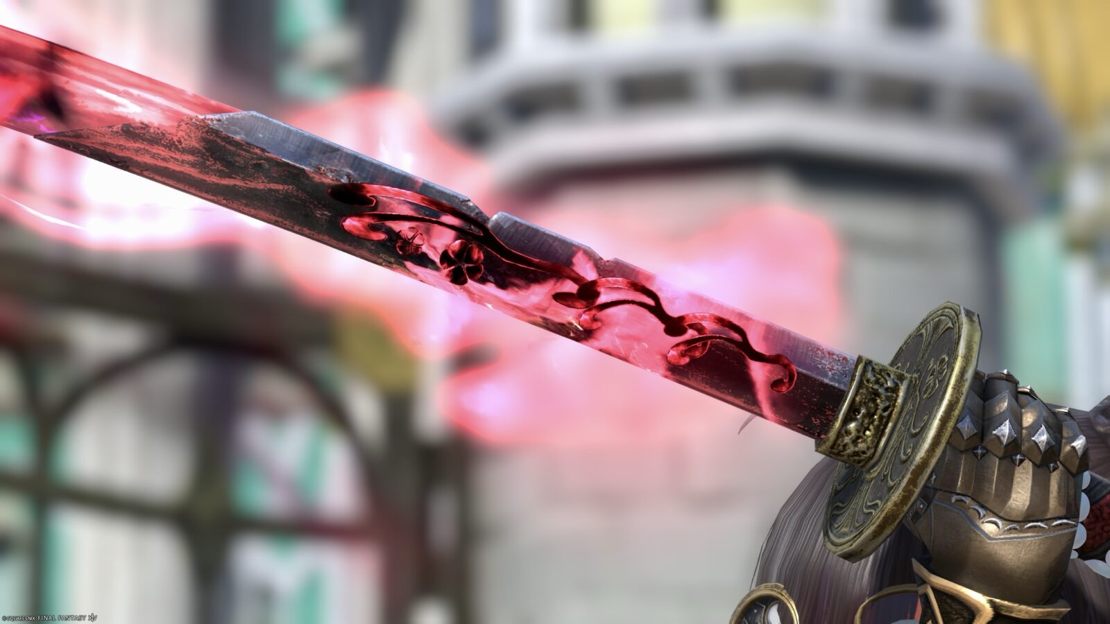 ピンクに近い赤く光るエフェクトが刃の周りを渦巻いています。まるで立ち昇る炎のよう。