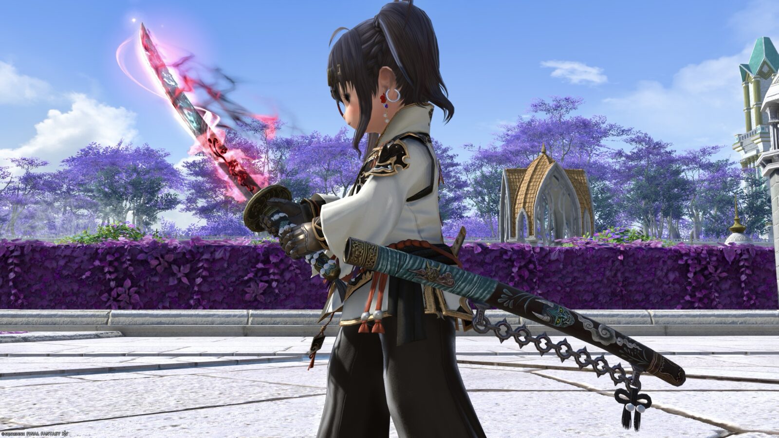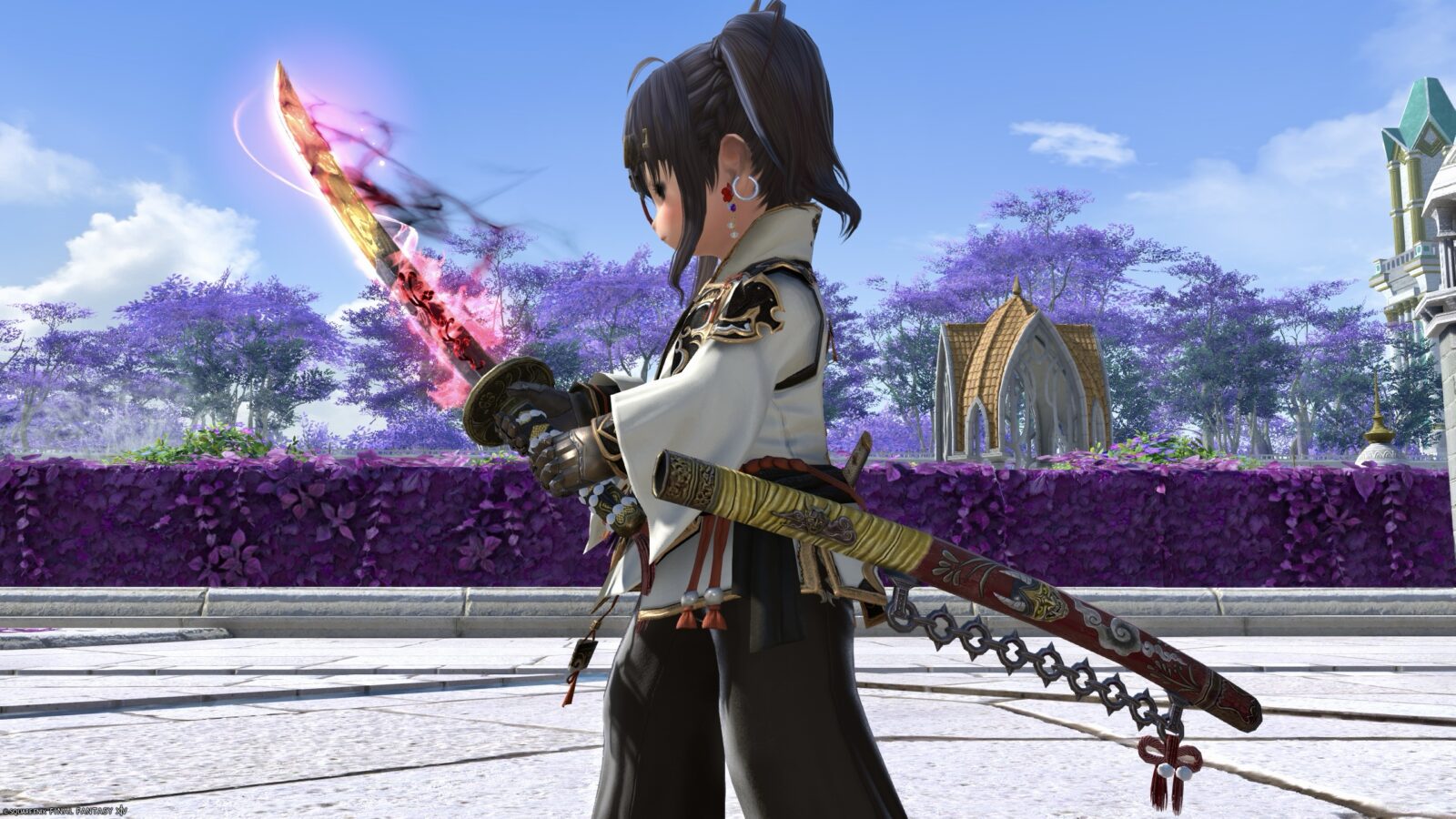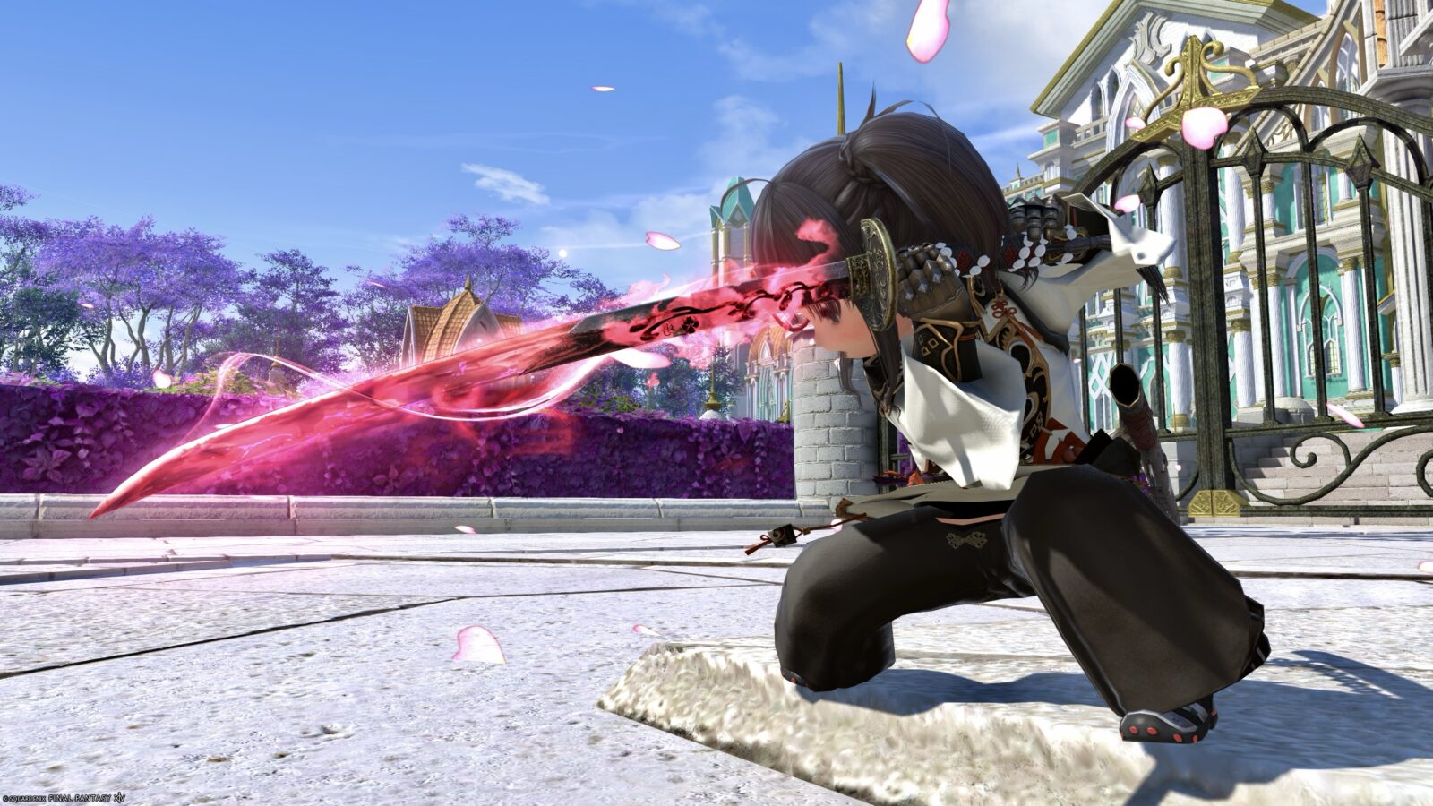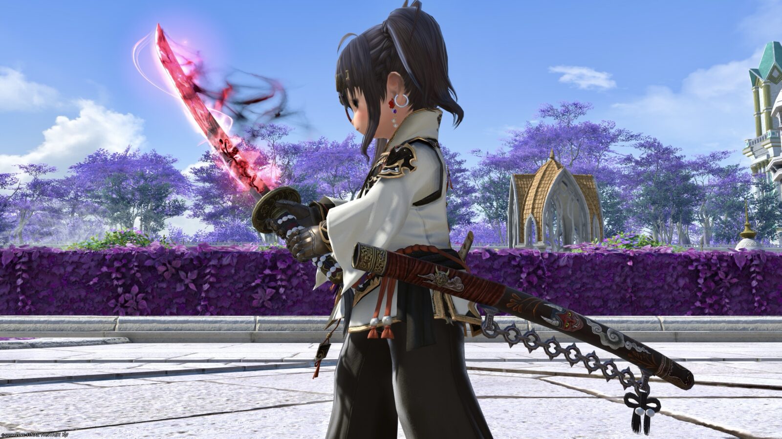 ピンクに近い赤く光るエフェクトが刃の周りを渦巻いています。まるで立ち昇る炎のよう。