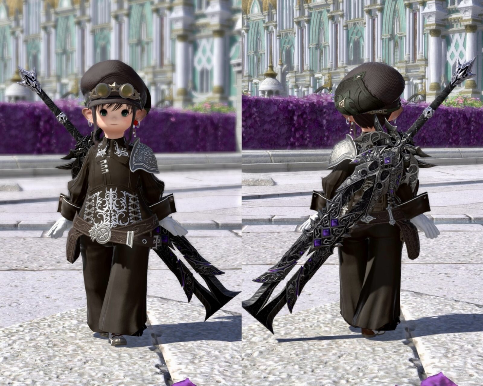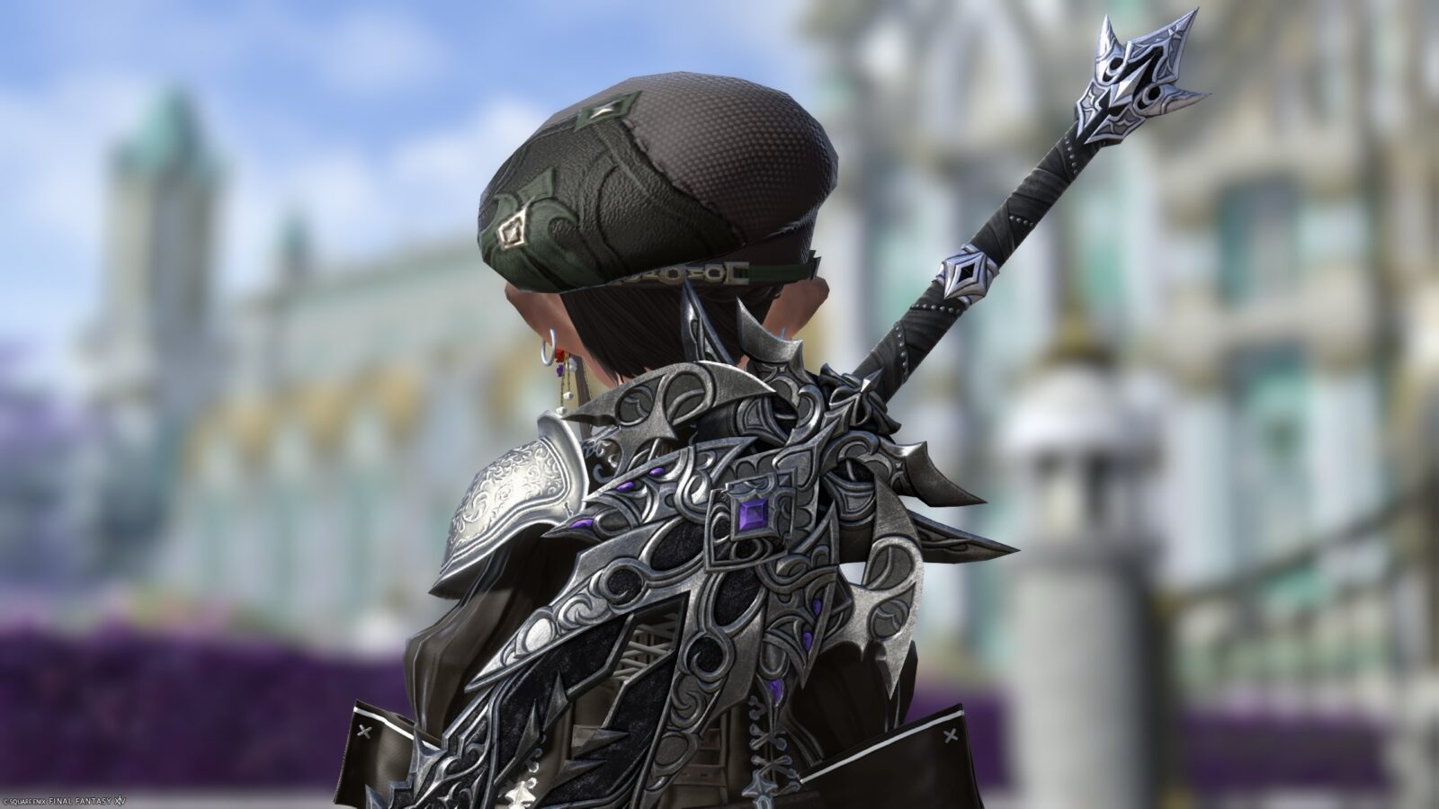 長方形で刀身の間が空いているのがオシャレ。紫の魔石がとても神秘的な雰囲気を醸し出しています。