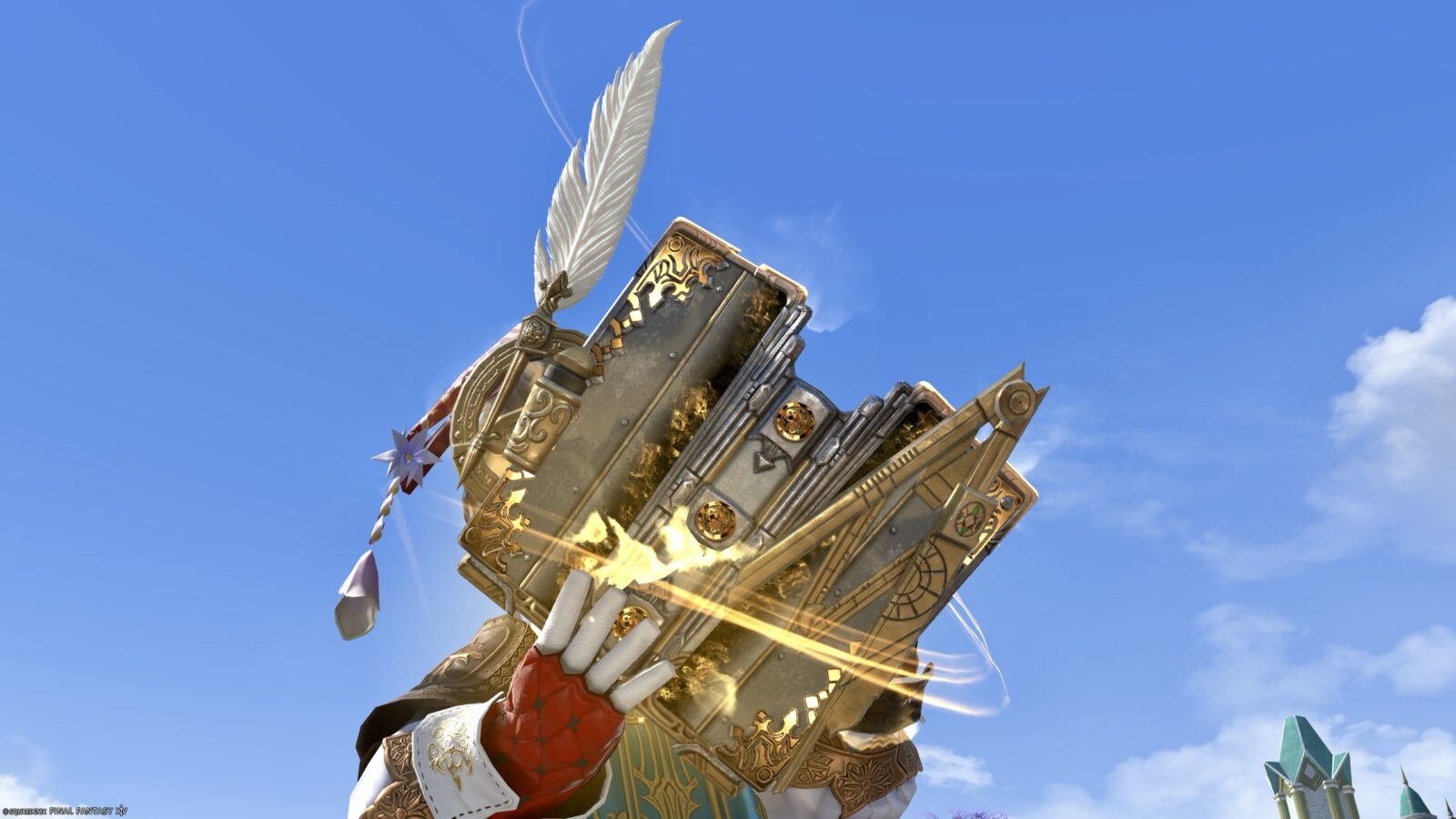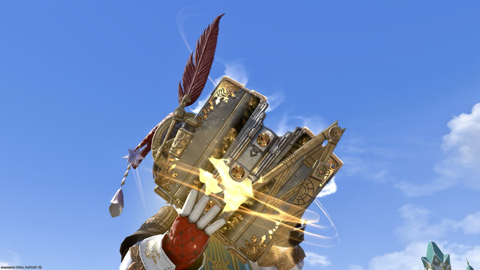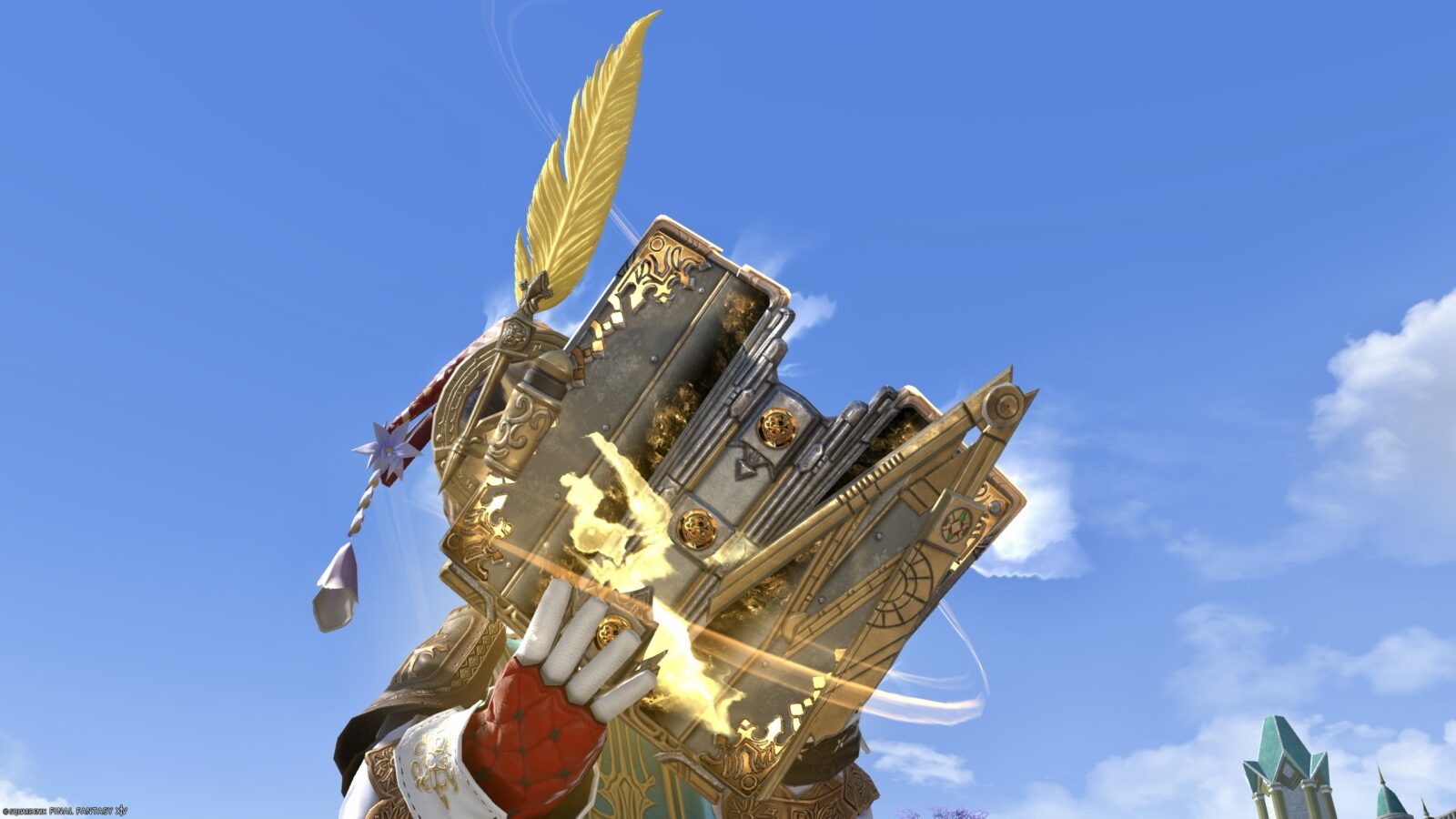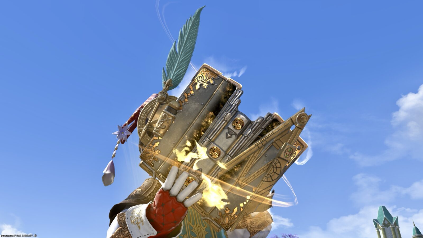 そして構えると黄金に輝くエフェクトが現れ、本の周りを光りの線が渦巻きます。