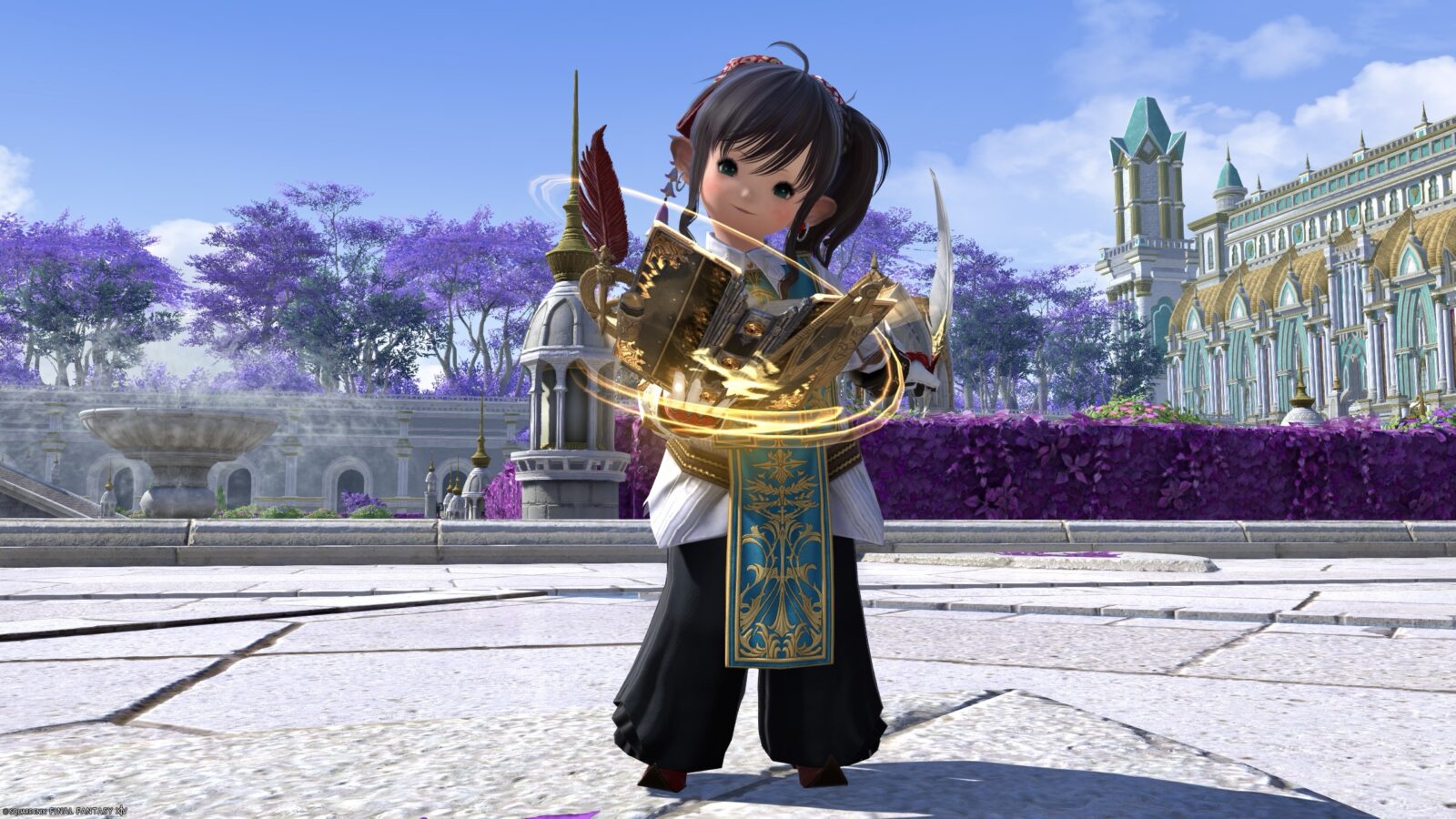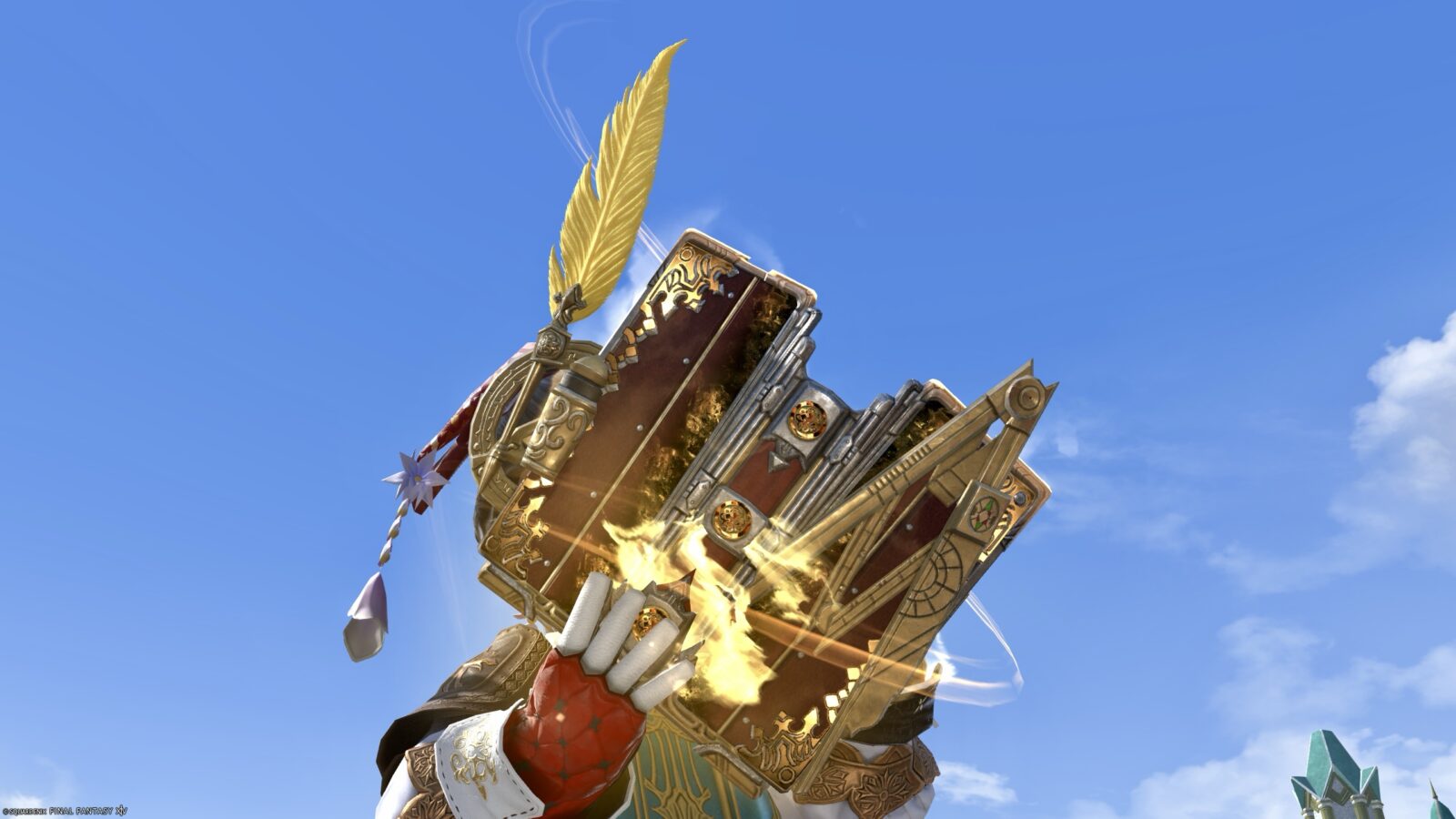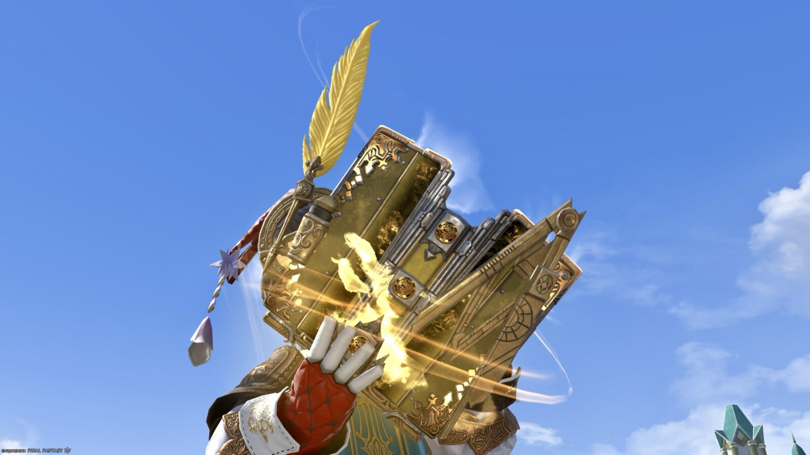 そして構えると黄金に輝くエフェクトが現れ、本の周りを光りの線が渦巻きます。