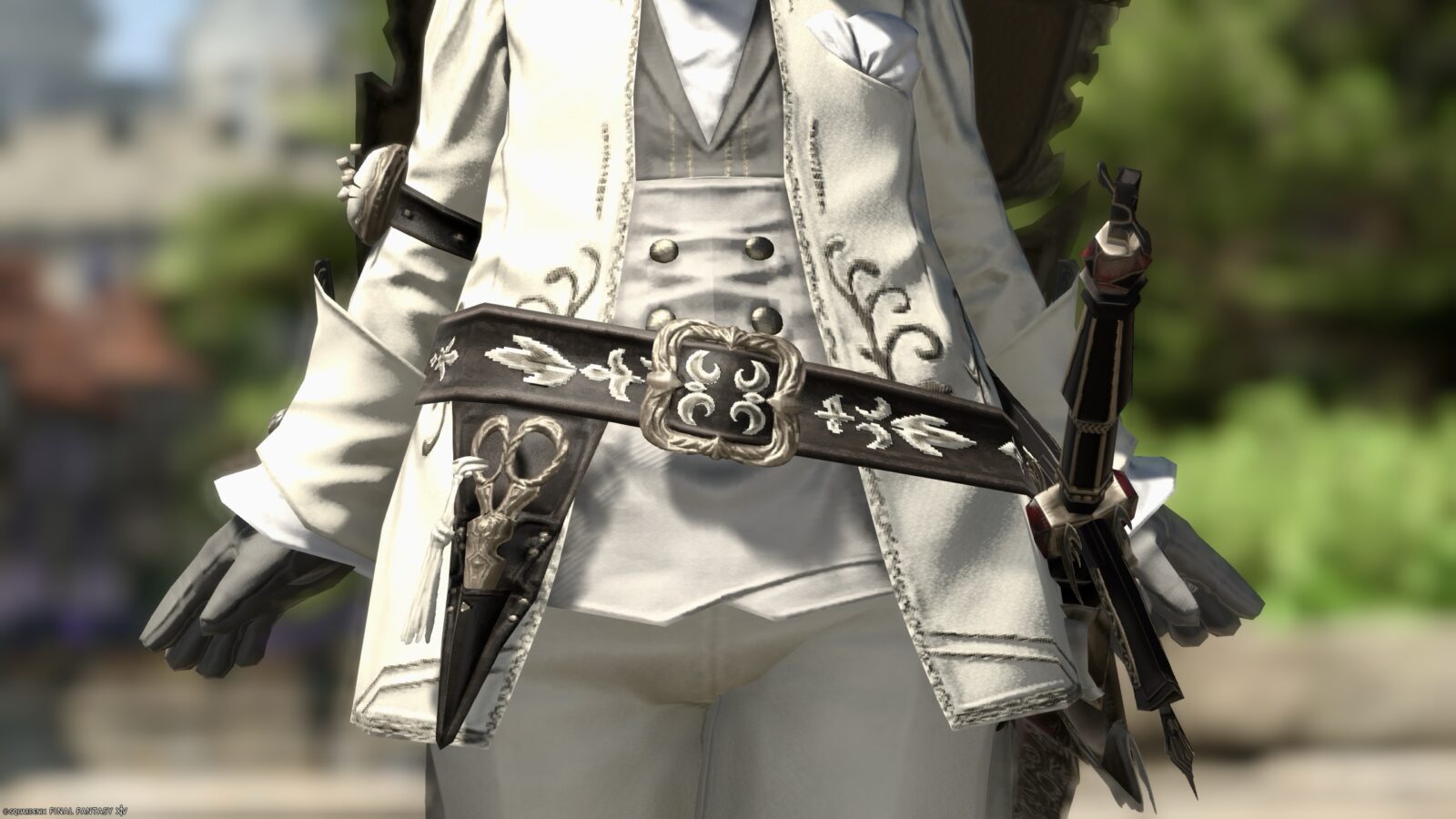 腰回りの太めの斜めがけベルトも素敵です。裁縫師装備だけにハサミも備えています。