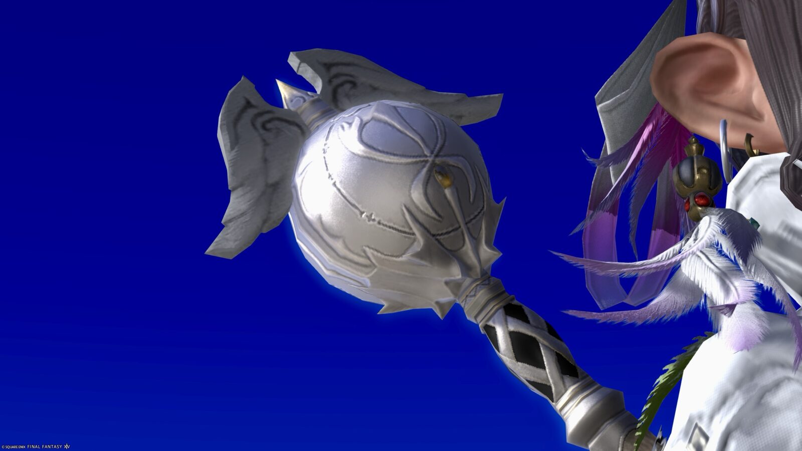 背負っている状態だと上部のシルバー球体が特徴的で小さな羽根飾りのある杖です。球体にはAW特有の紋章も。
